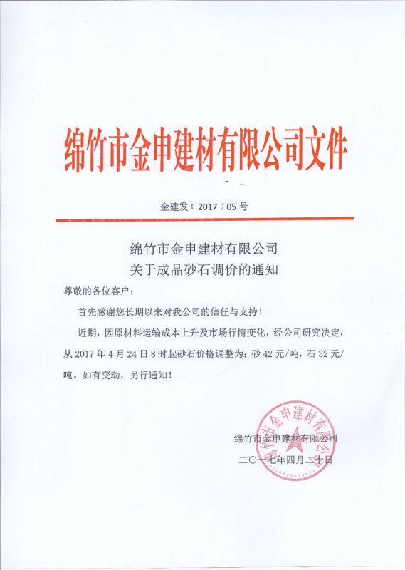 金申建材公司關(guān)于成品砂石調價(jià)的通知